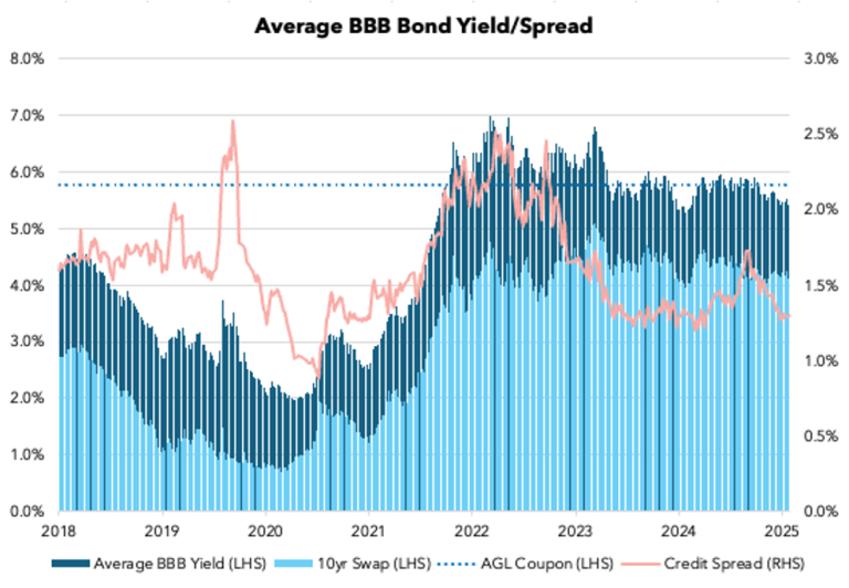 As a result of the swap rate (4.05%) + the credit spread (1.72%) we end up with a coupon for AGL of 5.77%. This is comfortably above 5.43%, which is the current average of its peers. It is also a very healthy level, only being exceeded during 2022 and the first half of 2023 (dotted blue line – left hand scale).
